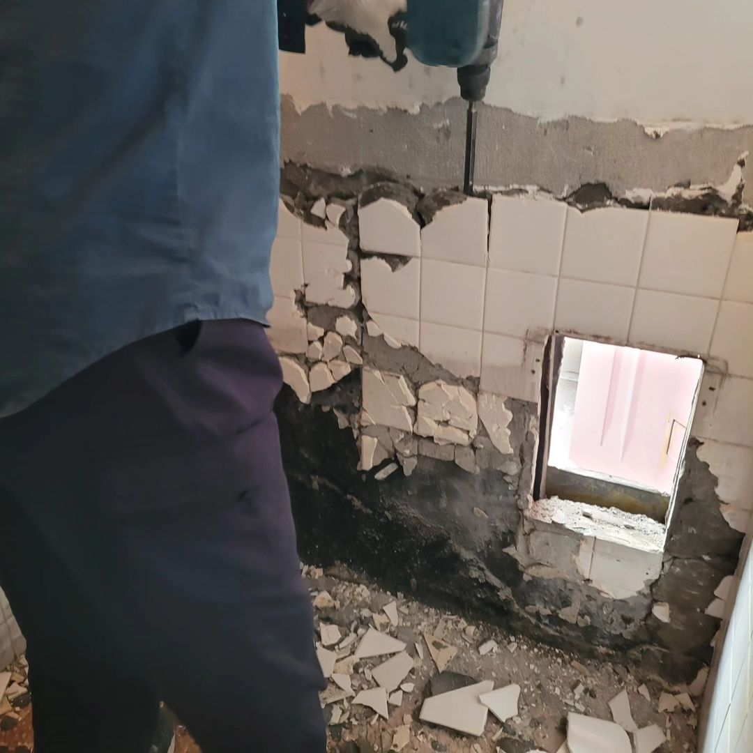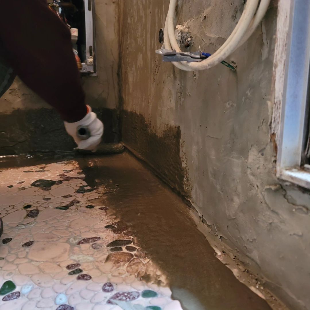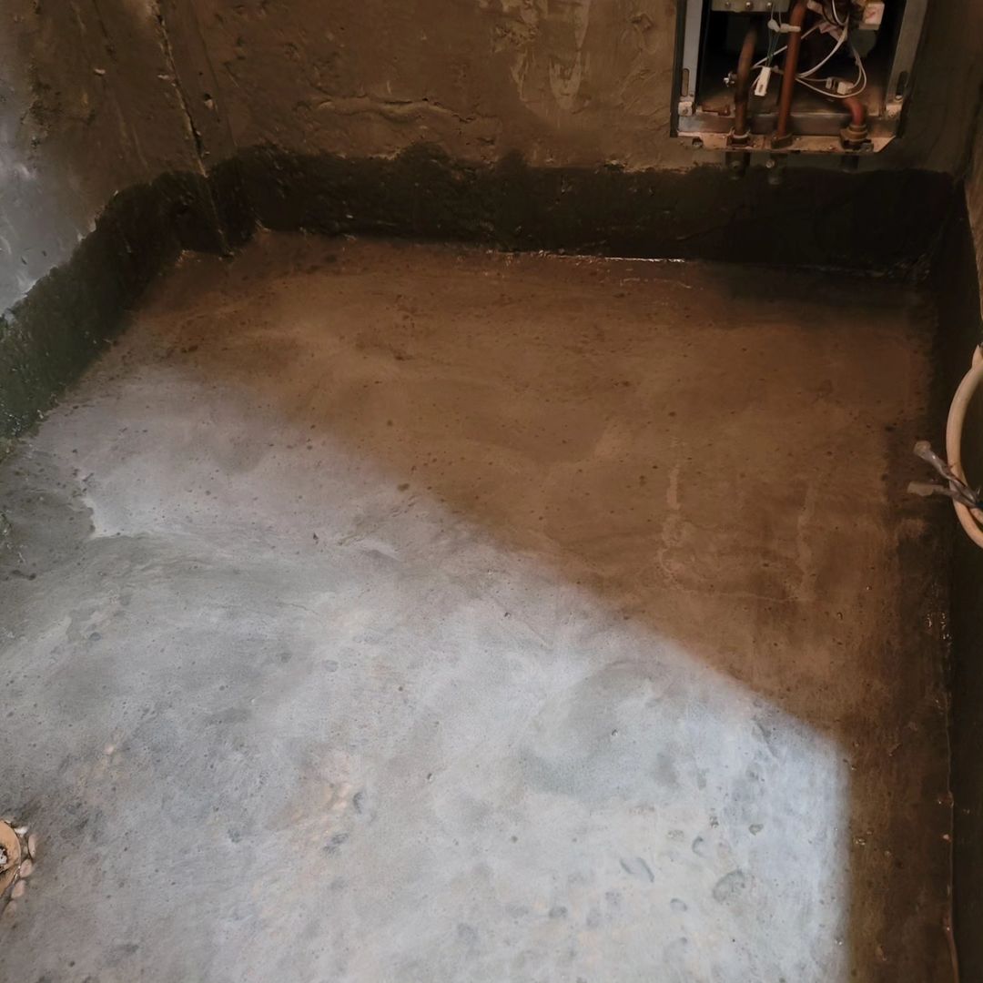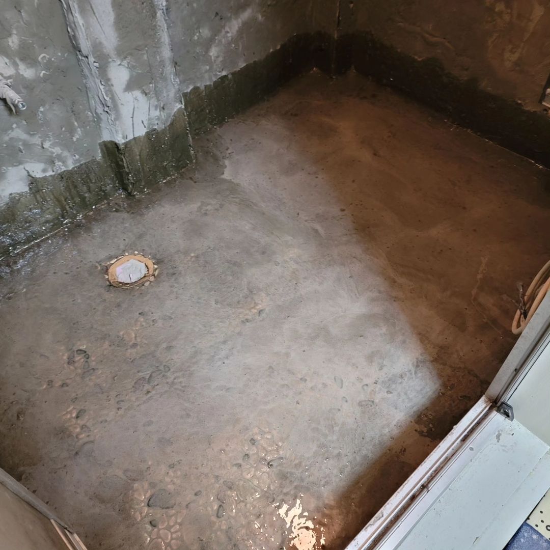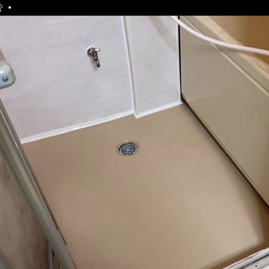 漏水していた浴室の改修工事です。 ユニットバスに変更すれば良いのですが、サイズとご予算が合わなかったので、こちらの写真のような改修方法を取りました。 お客様に、1日でも早くお風呂を使用していただくために、下地処理と防水効果のある、湿潤面に対応した、防水材を床に塗りました。 塗布後に、浴室用の、長尺シートを張り、完成でございます。
